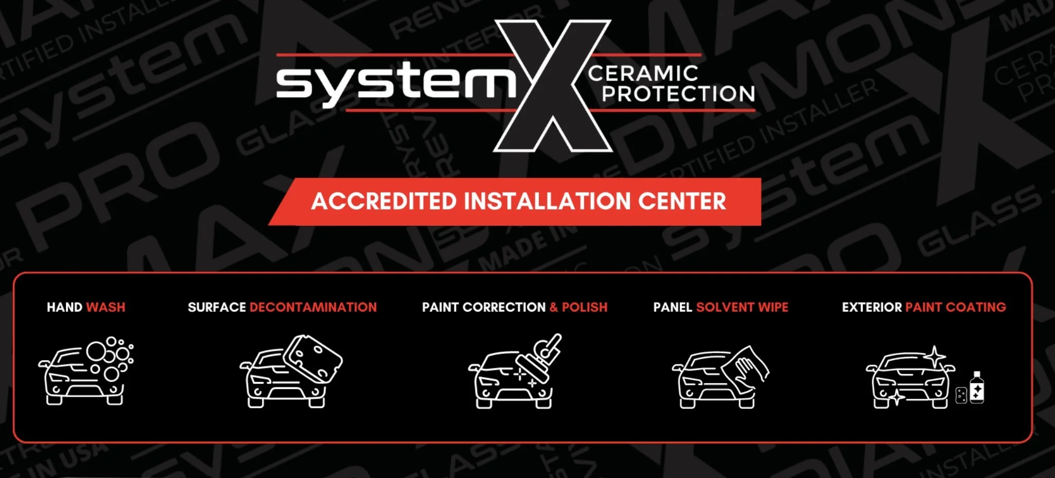 System X is a professional-grade ceramic coating system engineered to chemically bond with your vehicle’s surface and form a durable, impermeable barrier. System X products resist harsh chemicals, water, road grime, and other organic contaminants, making it much simpler to maintain a sleek, glossy, and clean finish. Unlike traditional waxes or sealants that wash away or break down over time, System X delivers years of consistent protection and long-lasting performance.
